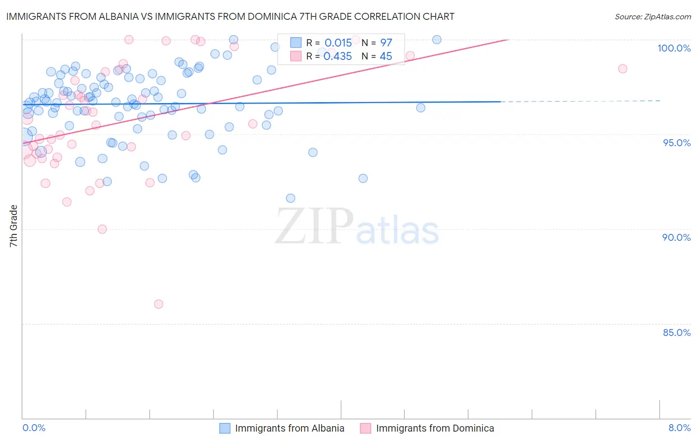 Immigrants from Albania vs Immigrants from Dominica 7th Grade Correlation Chart