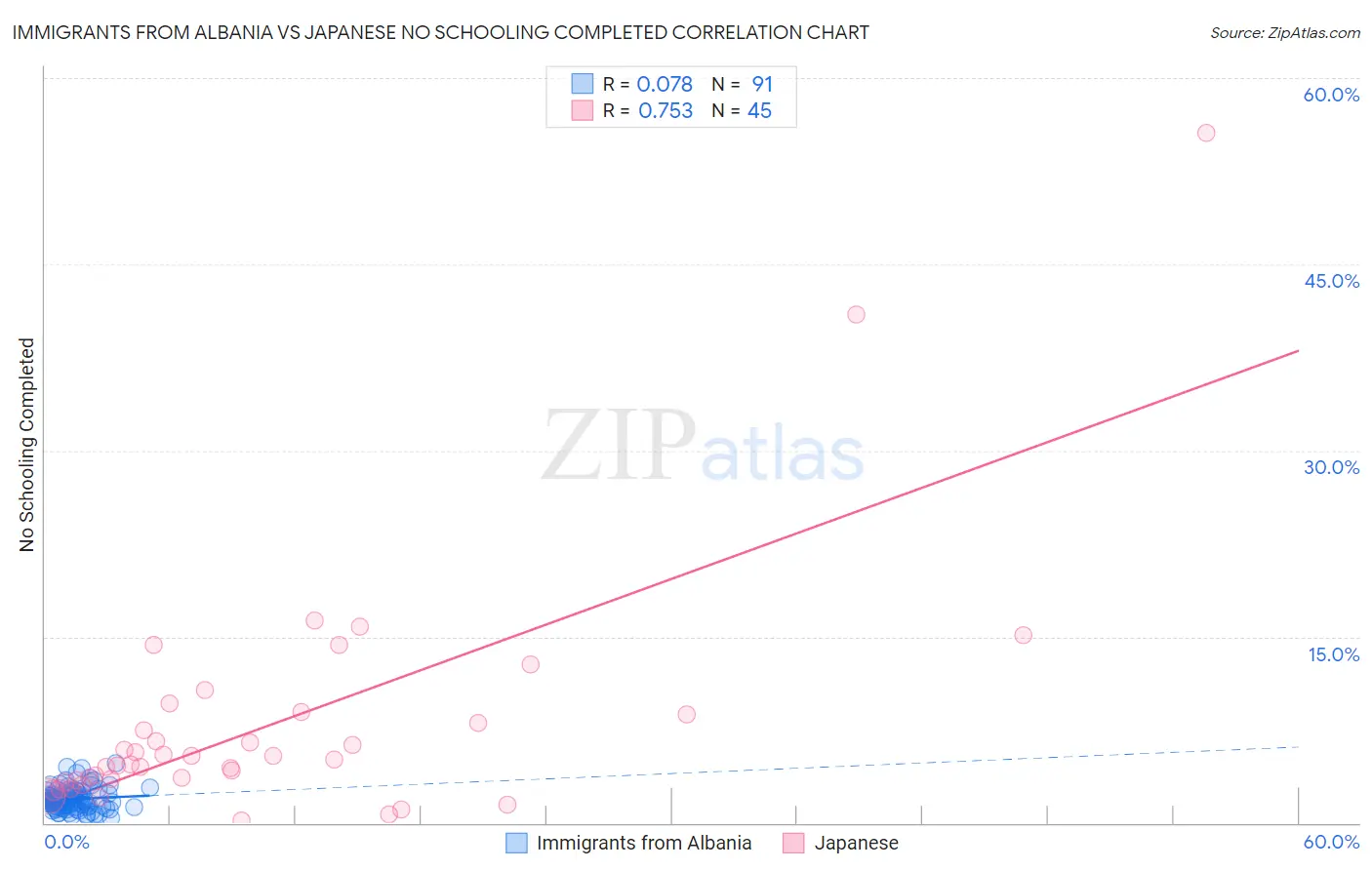 Immigrants from Albania vs Japanese No Schooling Completed Correlation Chart