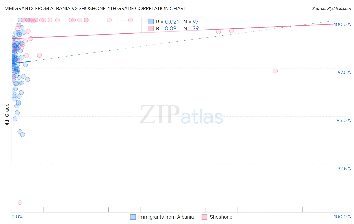 Immigrants from Albania vs Shoshone 4th Grade Correlation Chart