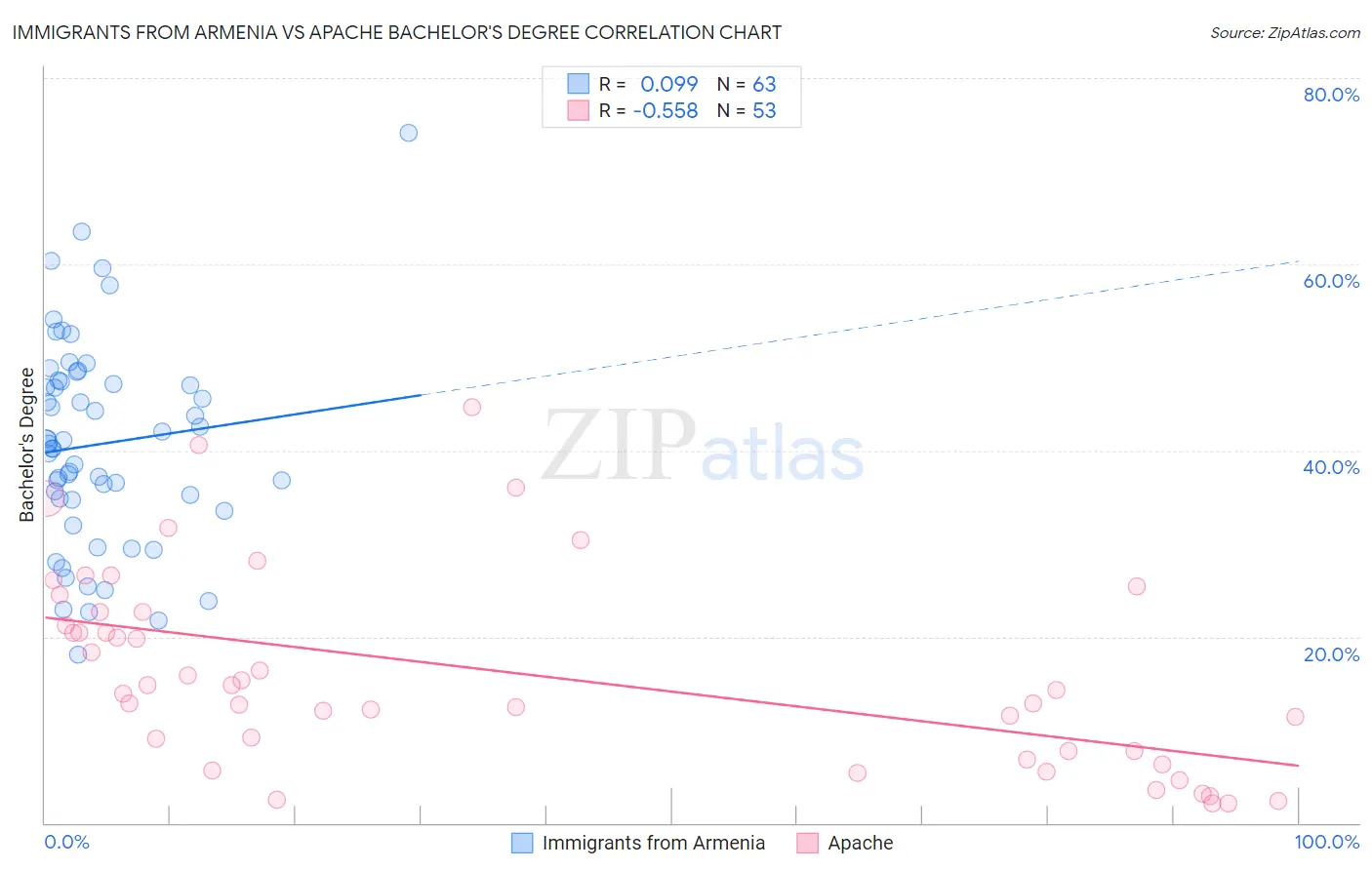 Immigrants from Armenia vs Apache Bachelor's Degree Correlation Chart