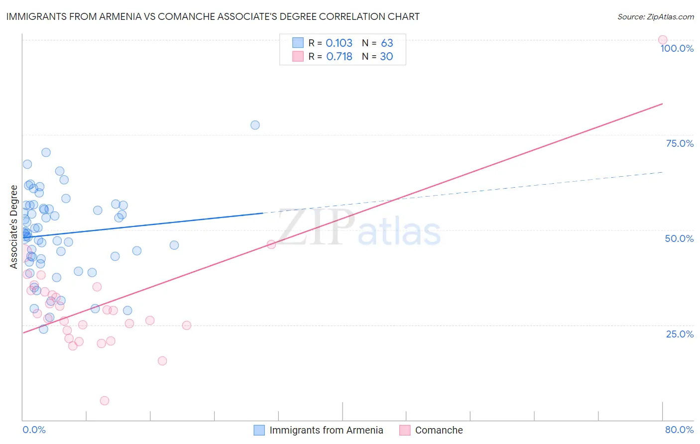 Immigrants from Armenia vs Comanche Associate's Degree Correlation Chart