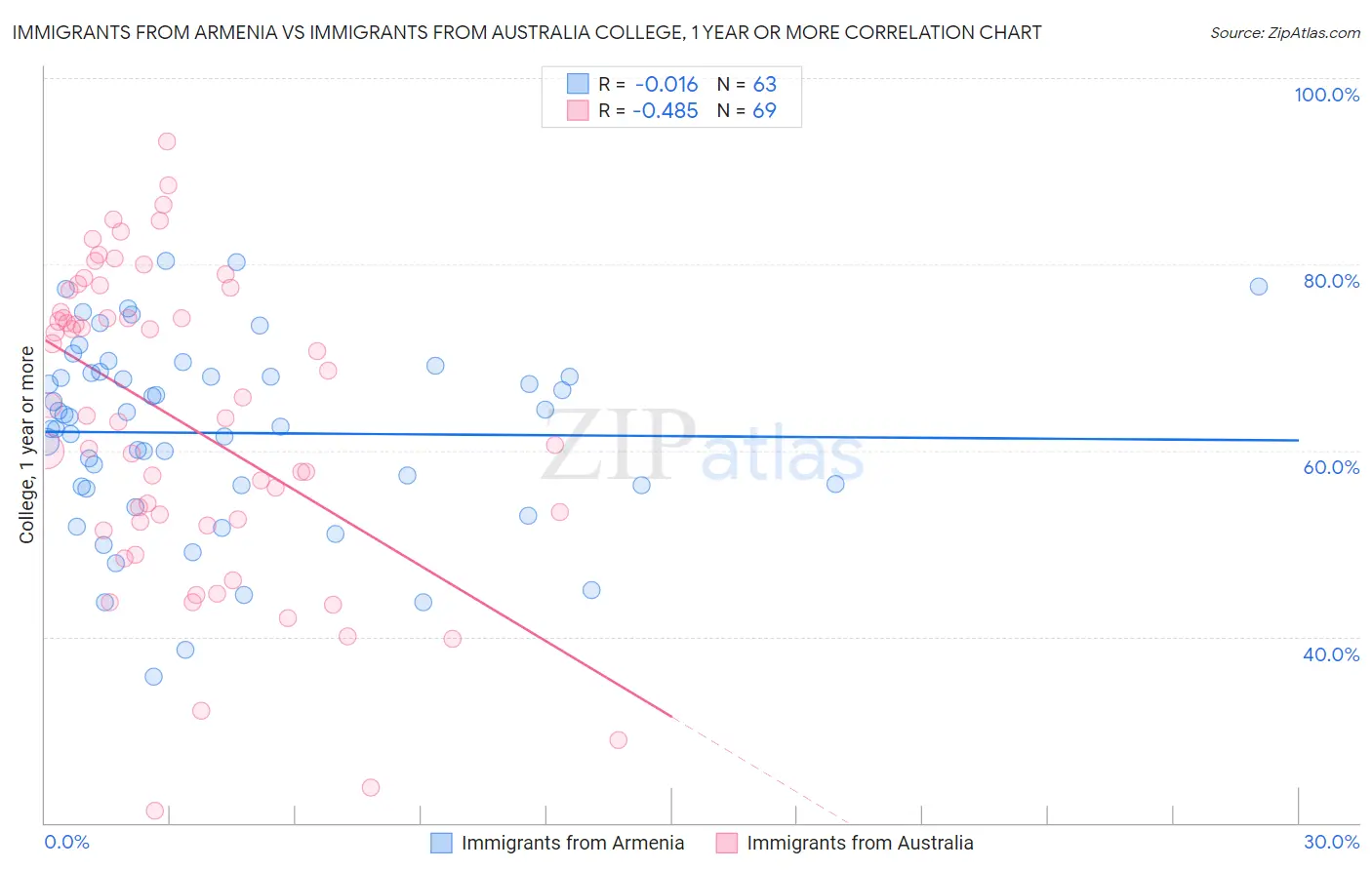 Immigrants from Armenia vs Immigrants from Australia College, 1 year or more Correlation Chart