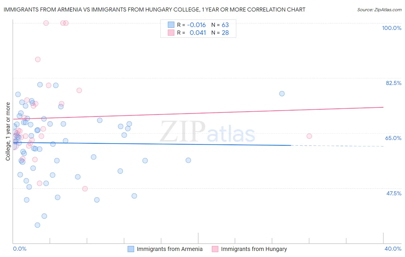 Immigrants from Armenia vs Immigrants from Hungary College, 1 year or more Correlation Chart