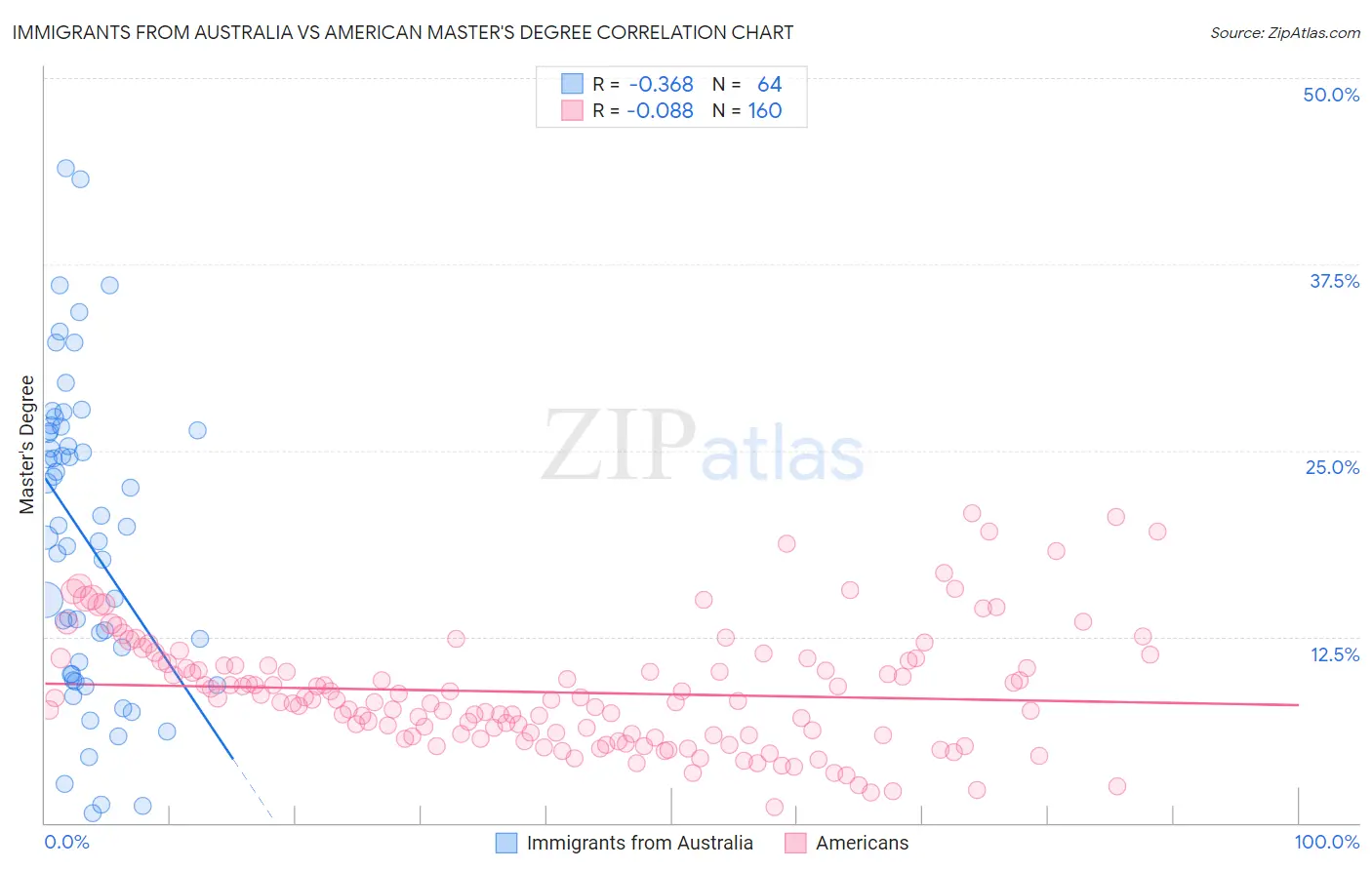 The statistical analysis conducted on geographies consisting of 227,173,113 people shows a mild negative correlation between the proportion of Immigrants from Australia and percentage of population with at least master's degree education in the United States with a correlation coefficient (R) of -0.368 and weighted average of 20.9%. Similarly, the statistical analysis conducted on geographies consisting of 580,510,045 people shows a slight negative correlation between the proportion of Americans and percentage of population with at least master's degree education in the United States with a correlation coefficient (R) of -0.088 and weighted average of 12.3%, a difference of 69.6%.
