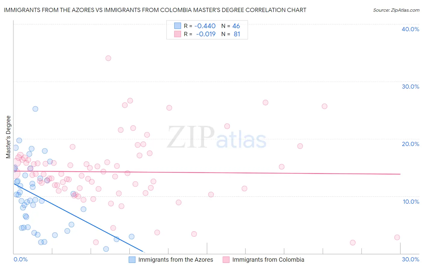 Immigrants from the Azores vs Immigrants from Colombia Master's Degree Correlation Chart