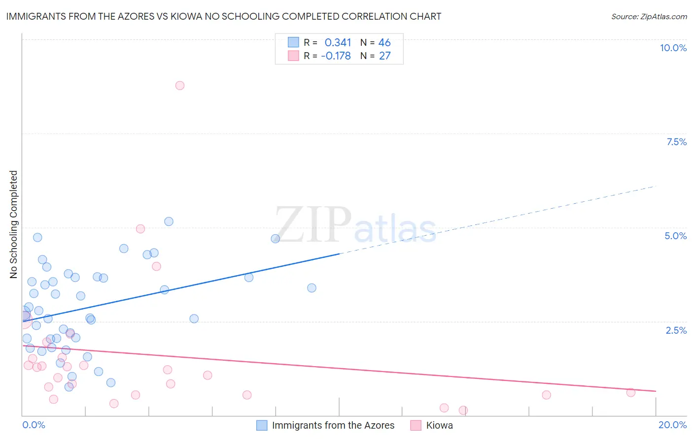 Immigrants from the Azores vs Kiowa No Schooling Completed Correlation Chart