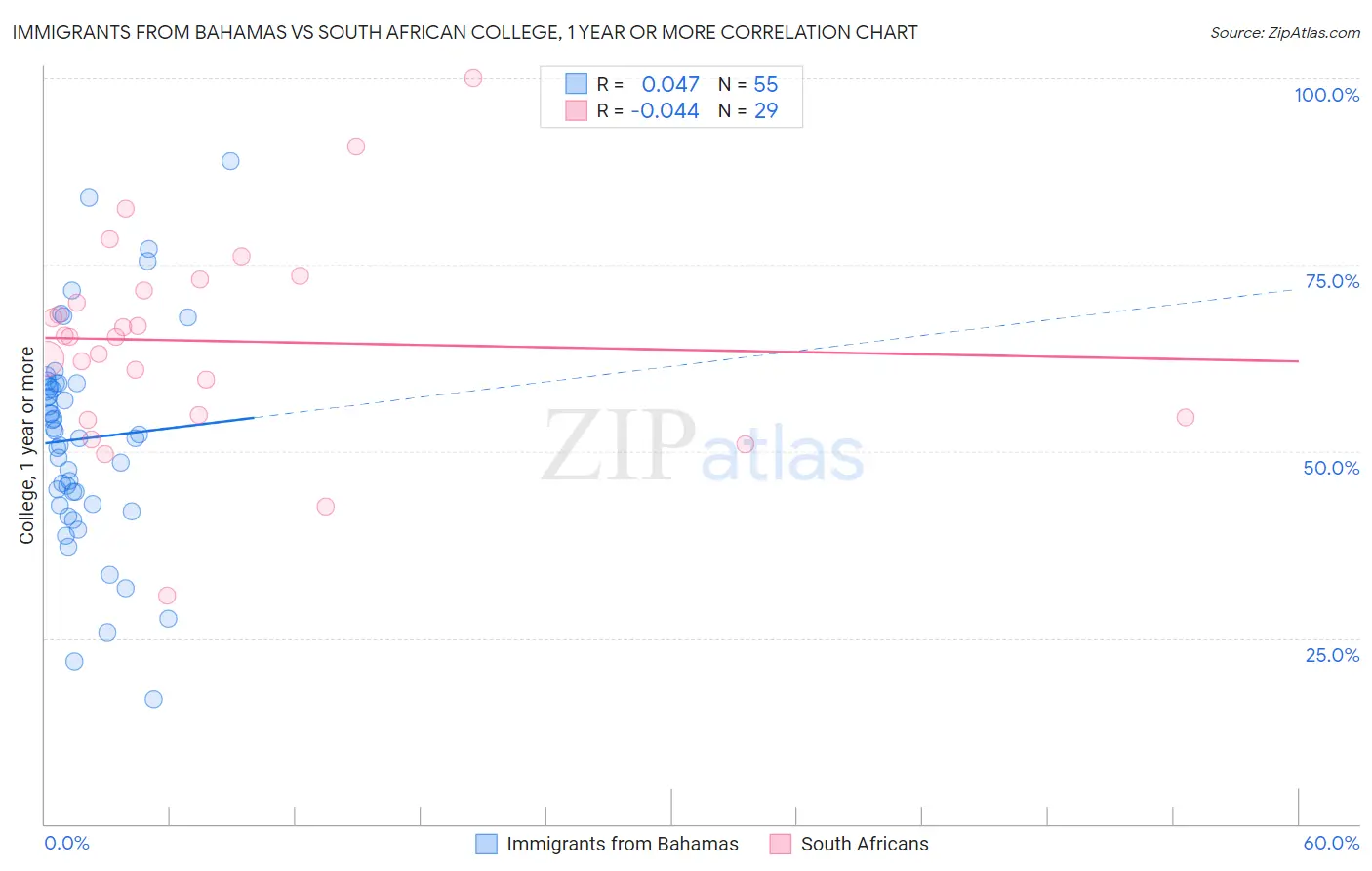 Immigrants from Bahamas vs South African College, 1 year or more Correlation Chart