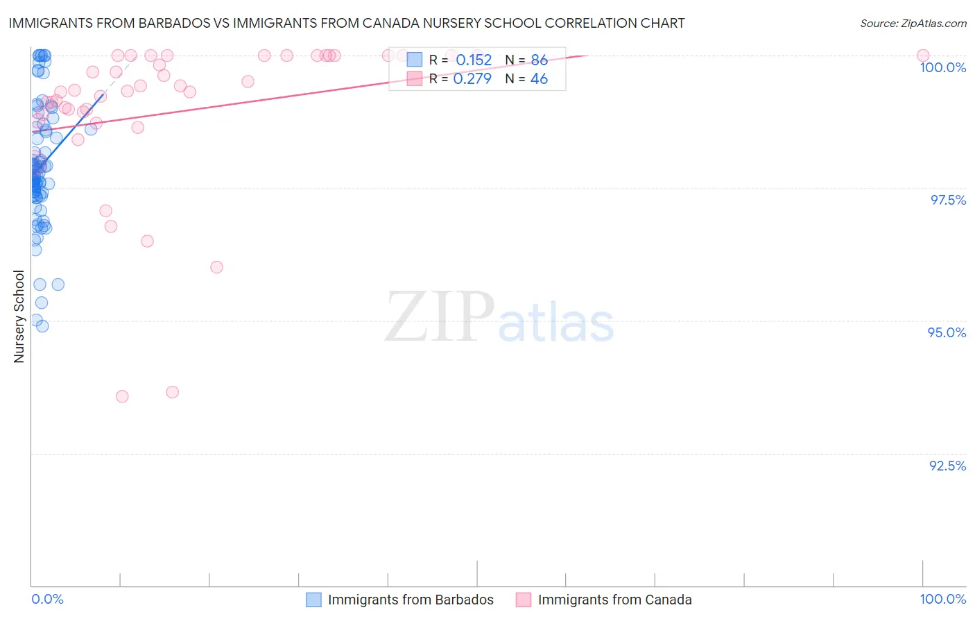 Immigrants from Barbados vs Immigrants from Canada Nursery School Correlation Chart