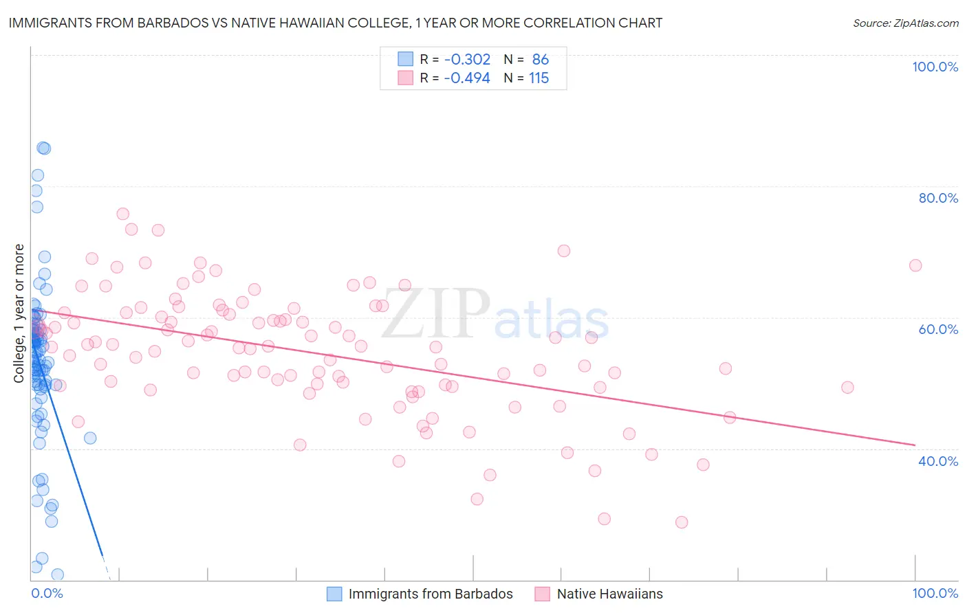 Immigrants from Barbados vs Native Hawaiian College, 1 year or more Correlation Chart