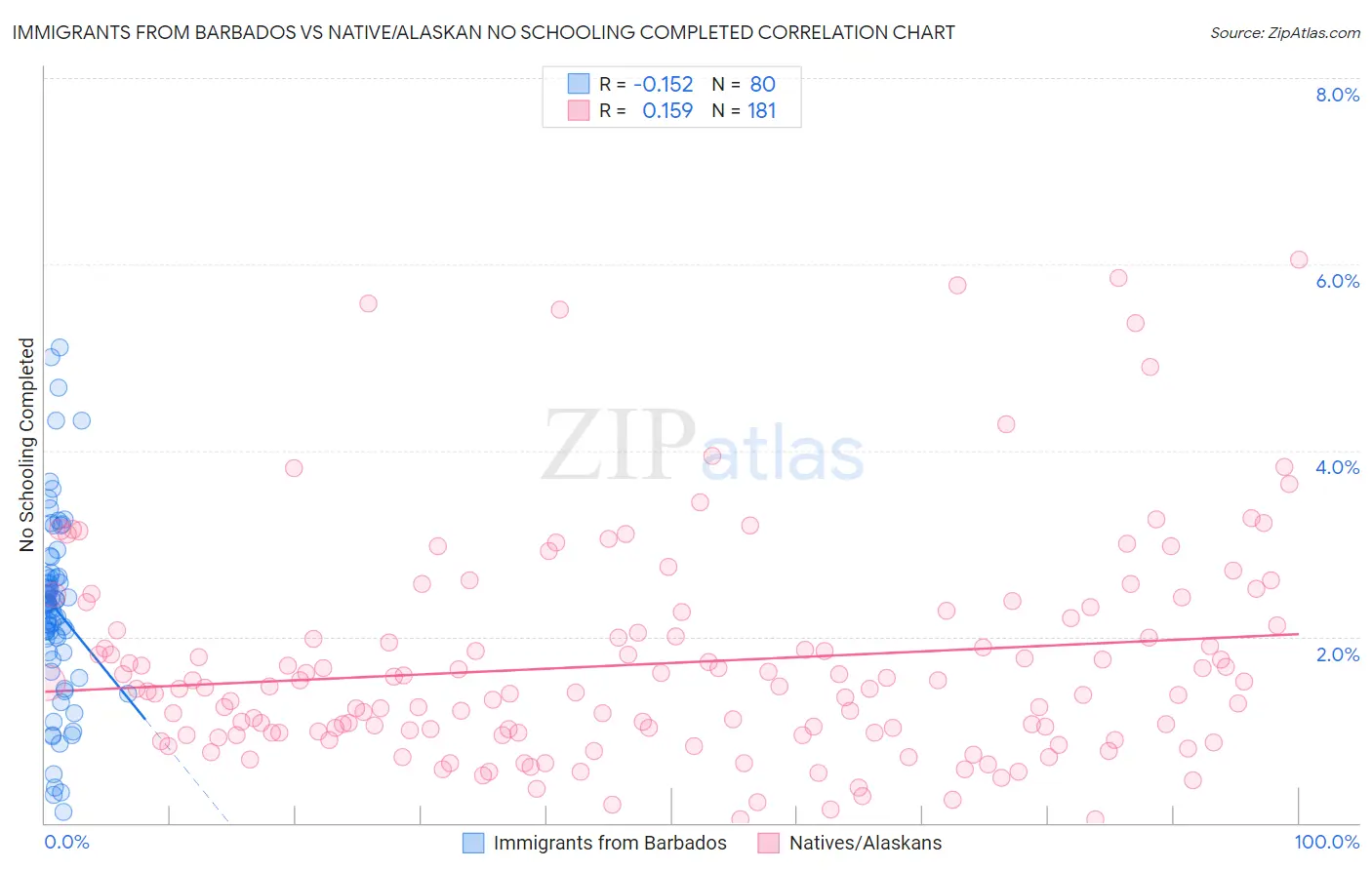 Immigrants from Barbados vs Native/Alaskan No Schooling Completed Correlation Chart