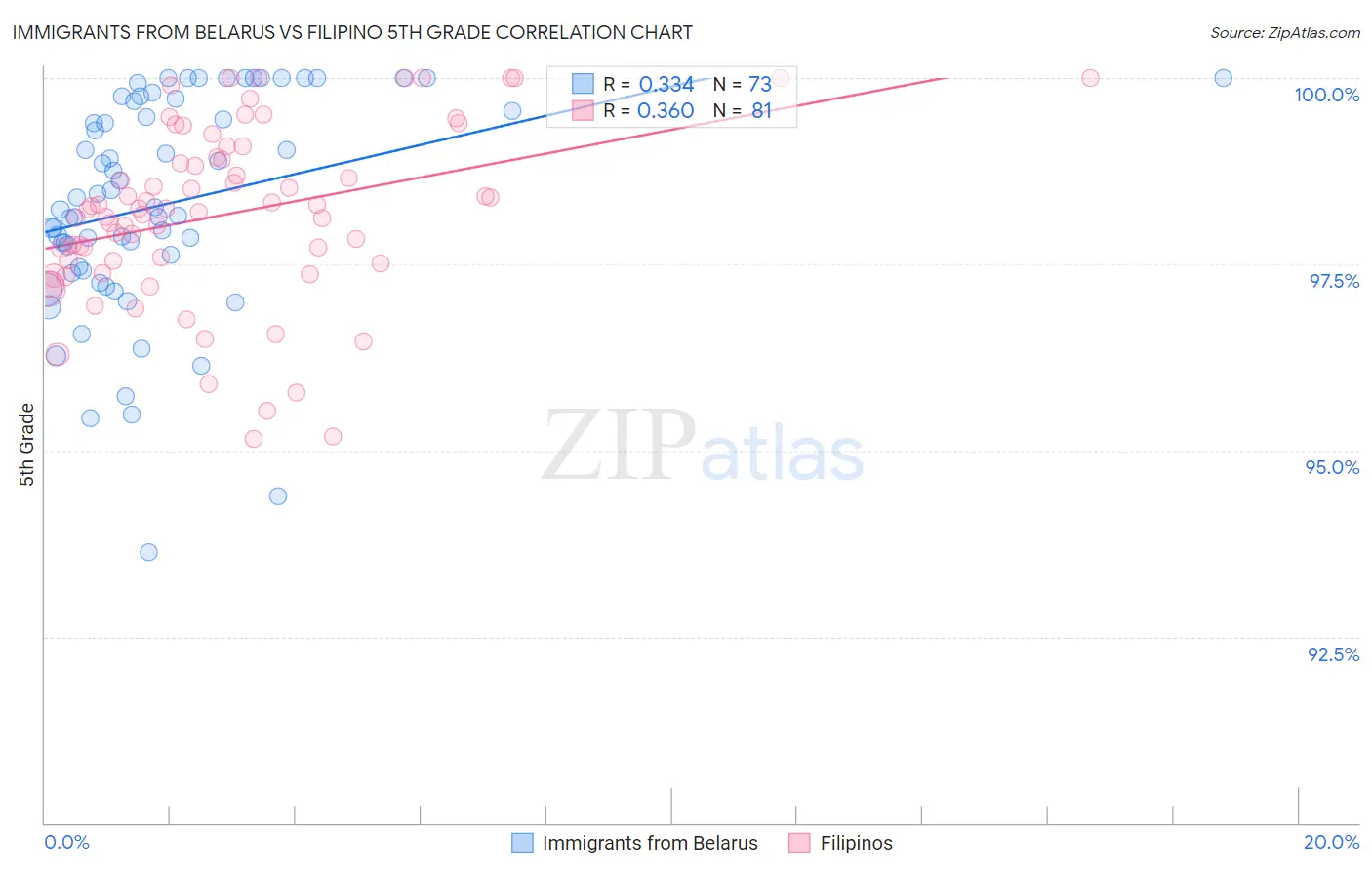 The statistical analysis conducted on geographies consisting of 150,073,430 people shows a mild positive correlation between the proportion of Immigrants from Belarus and percentage of population with at least 5th grade education in the United States with a correlation coefficient (R) of 0.334 and weighted average of 97.3%. Similarly, the statistical analysis conducted on geographies consisting of 254,351,427 people shows a mild positive correlation between the proportion of Filipinos and percentage of population with at least 5th grade education in the United States with a correlation coefficient (R) of 0.360 and weighted average of 97.5%, a difference of 0.18%.