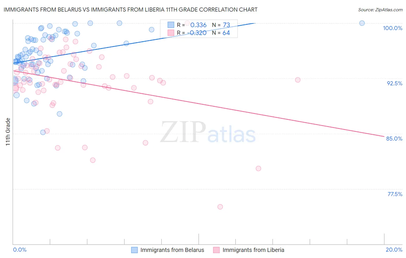 Immigrants from Belarus vs Immigrants from Liberia 11th Grade Correlation Chart