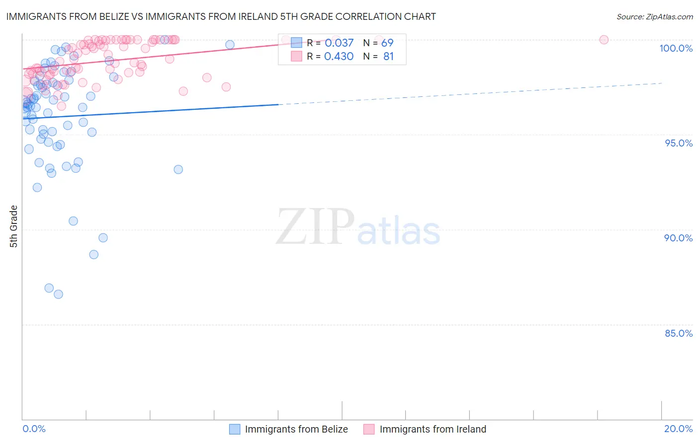 Immigrants from Belize vs Immigrants from Ireland 5th Grade Correlation Chart