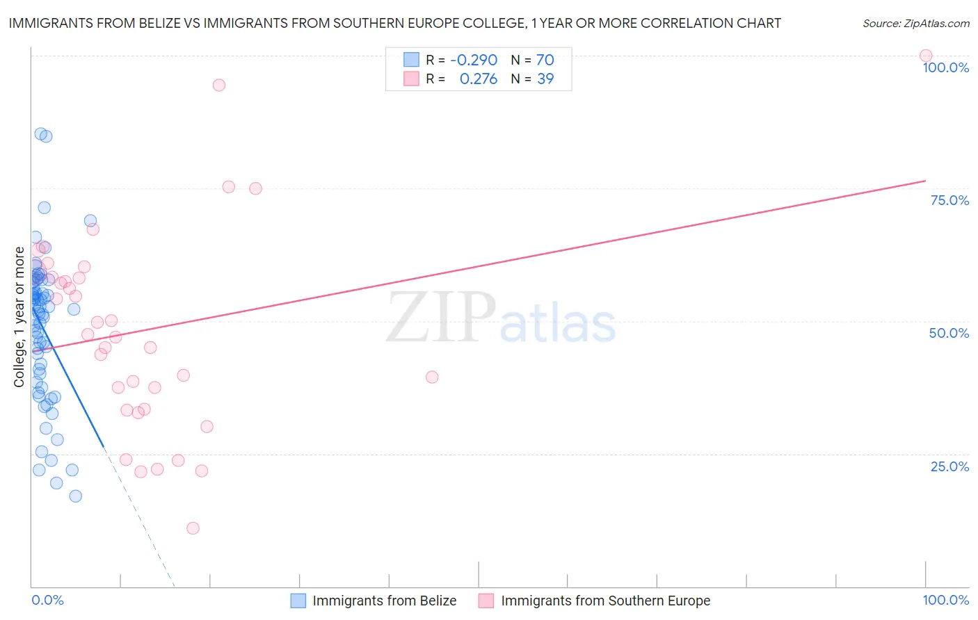 Immigrants from Belize vs Immigrants from Southern Europe College, 1 year or more Correlation Chart