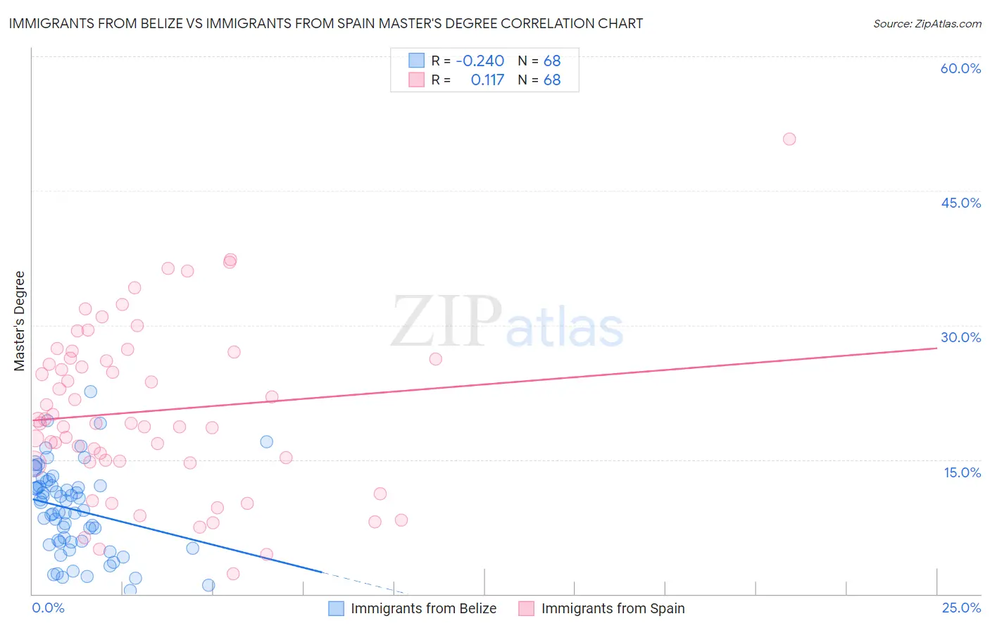 Immigrants from Belize vs Immigrants from Spain Master's Degree Correlation Chart