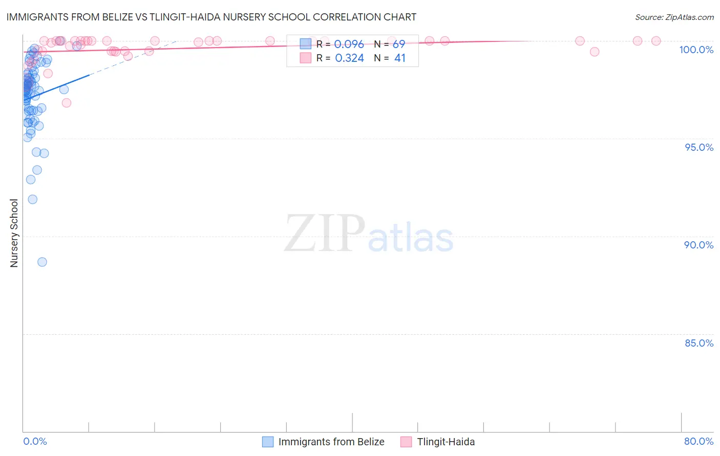 Immigrants from Belize vs Tlingit-Haida Nursery School Correlation Chart