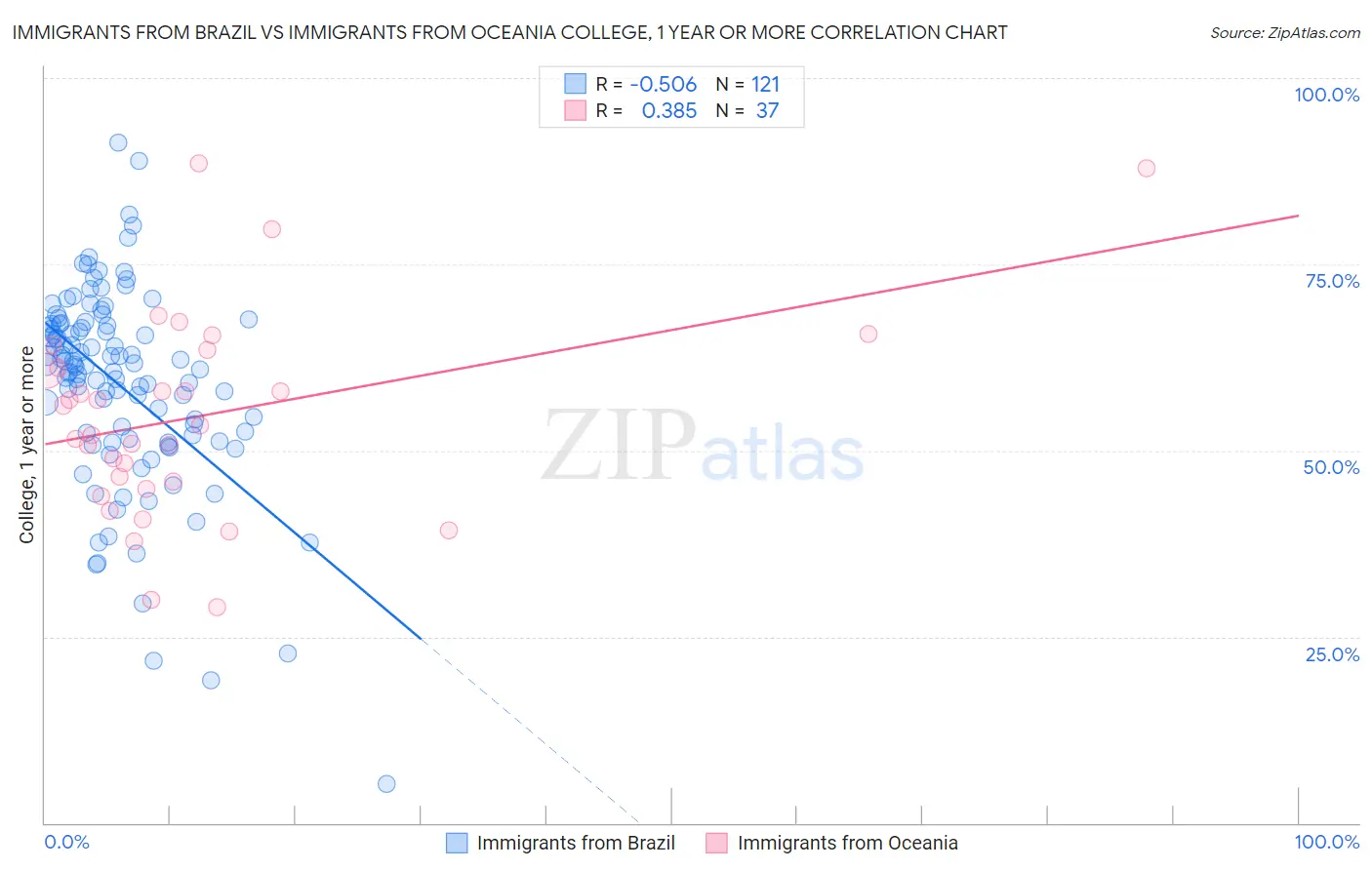 Immigrants from Brazil vs Immigrants from Oceania College, 1 year or more Correlation Chart