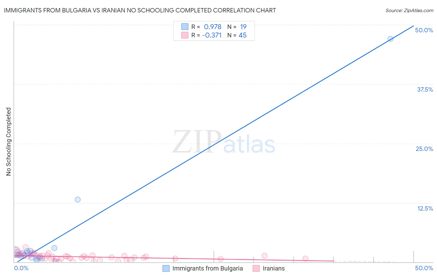 Immigrants from Bulgaria vs Iranian No Schooling Completed Correlation Chart