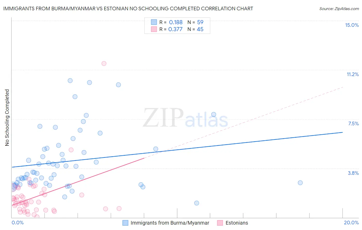 Immigrants from Burma/Myanmar vs Estonian No Schooling Completed Correlation Chart