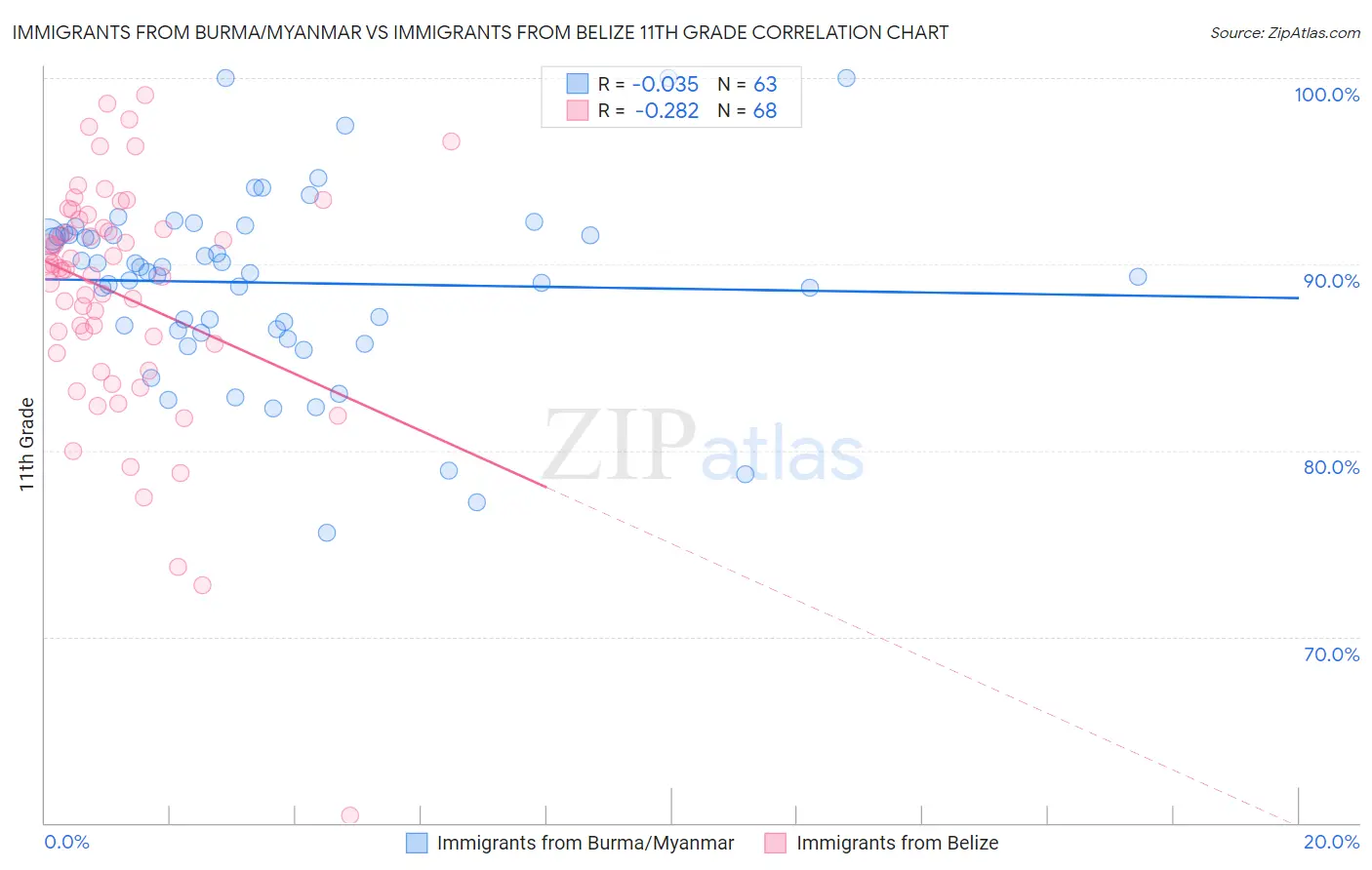Immigrants from Burma/Myanmar vs Immigrants from Belize 11th Grade Correlation Chart