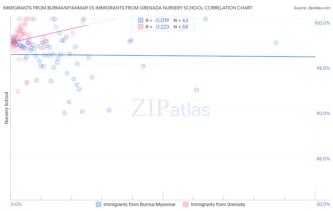Immigrants from Burma/Myanmar vs Immigrants from Grenada Nursery School Correlation Chart