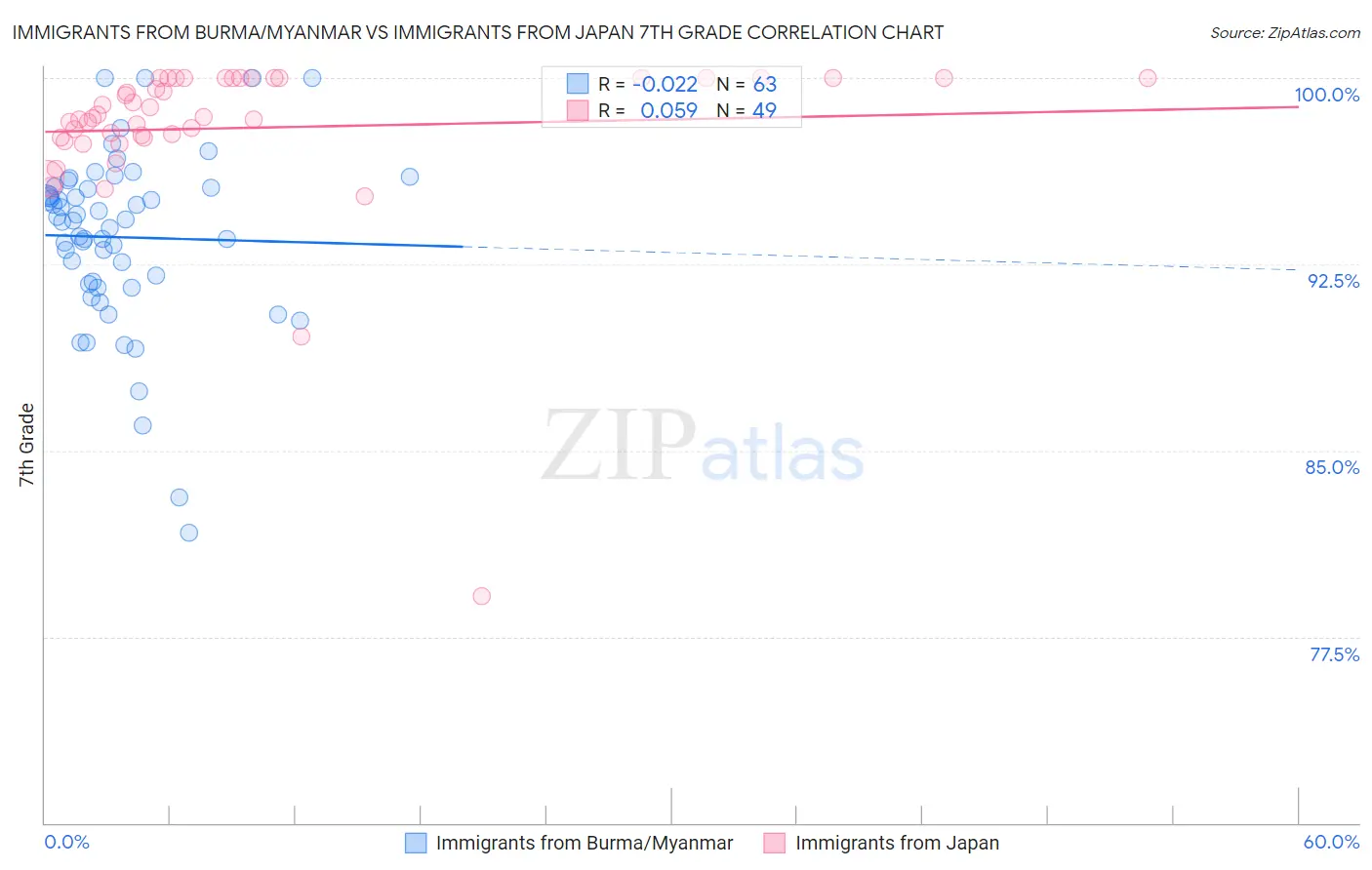 Immigrants from Burma/Myanmar vs Immigrants from Japan 7th Grade Correlation Chart