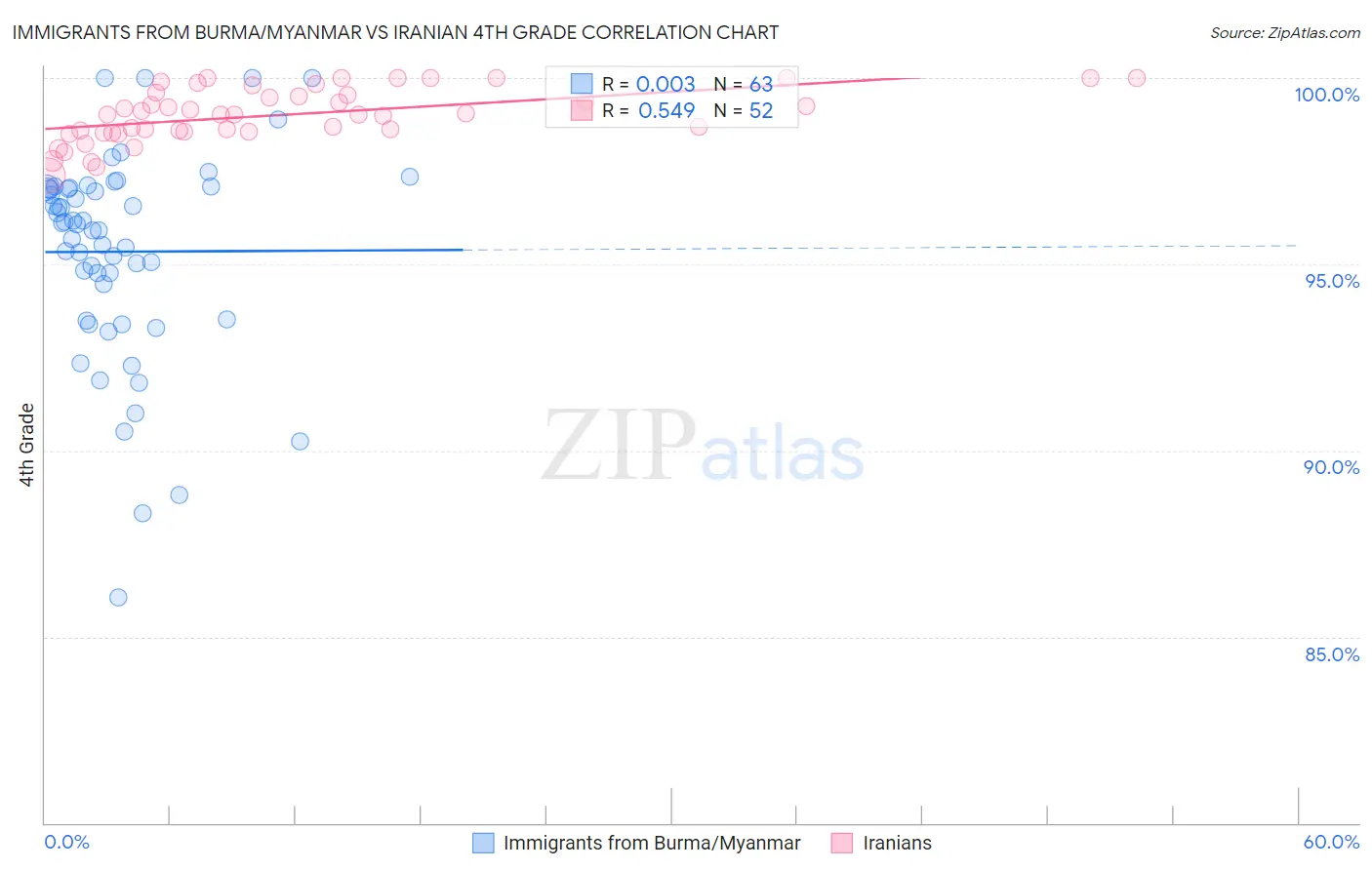 Immigrants from Burma/Myanmar vs Iranian 4th Grade Correlation Chart
