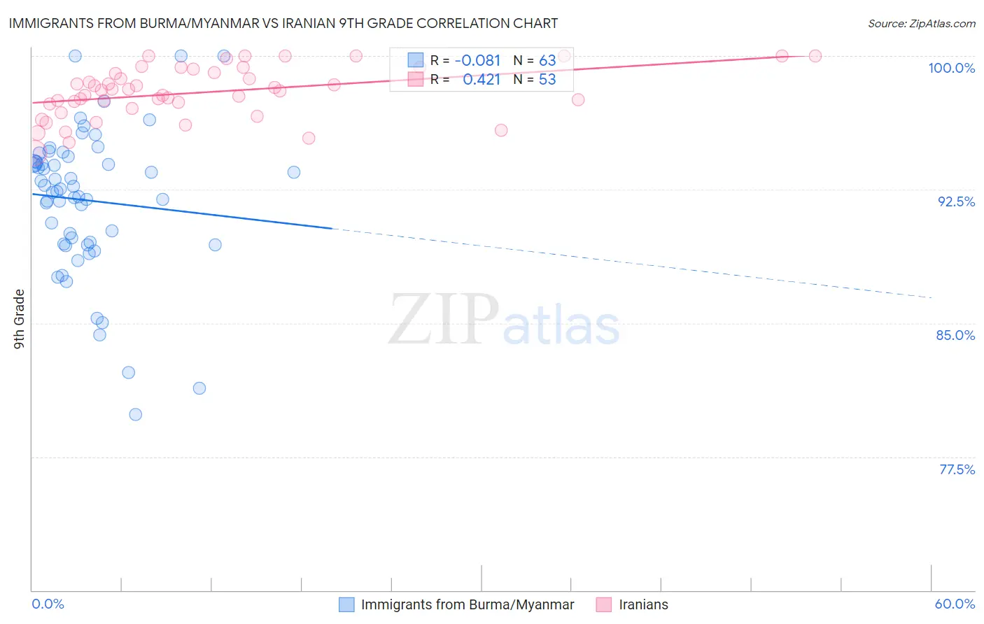 Immigrants from Burma/Myanmar vs Iranian 9th Grade Correlation Chart