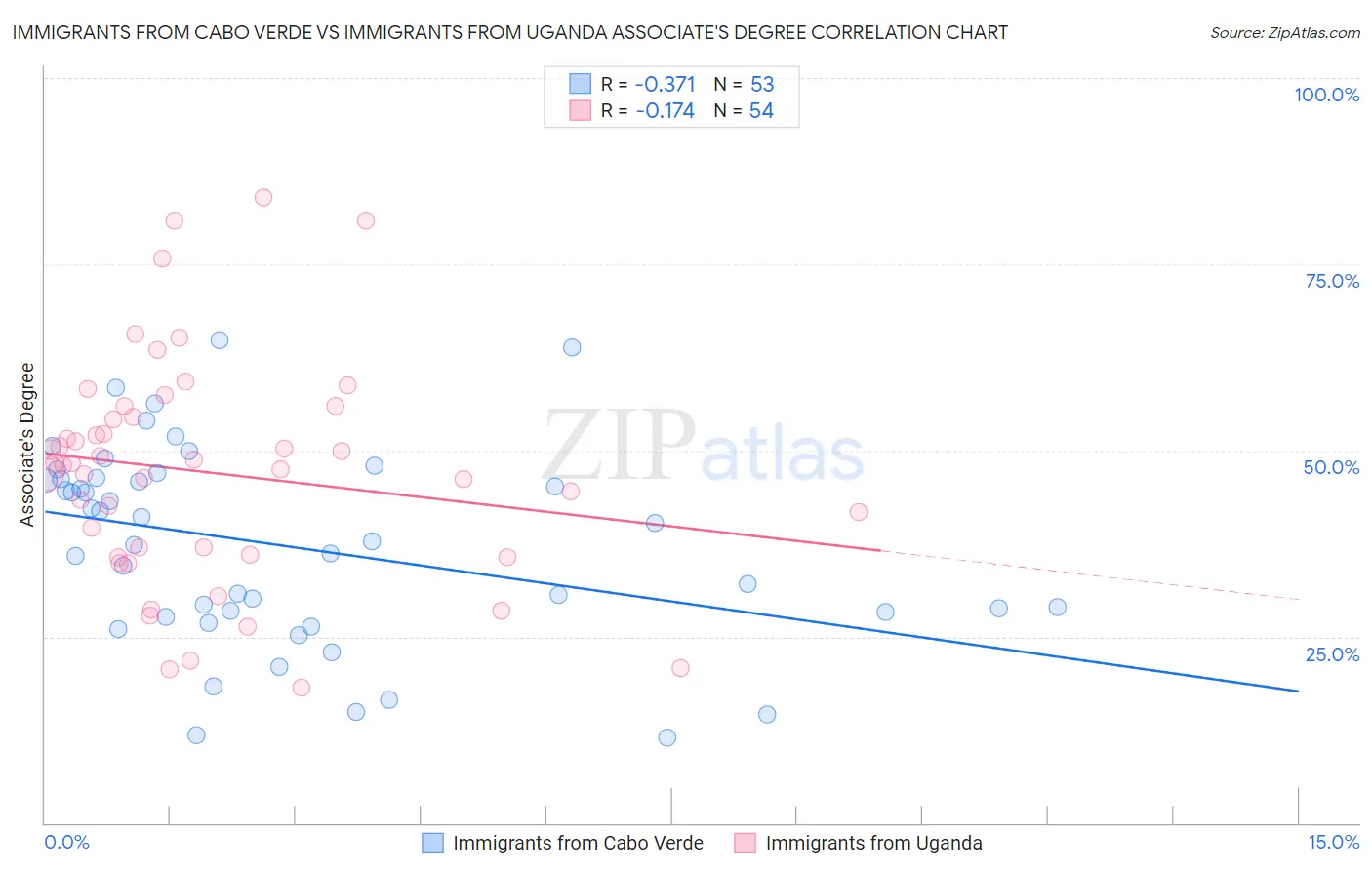 Immigrants from Cabo Verde vs Immigrants from Uganda Associate's Degree Correlation Chart