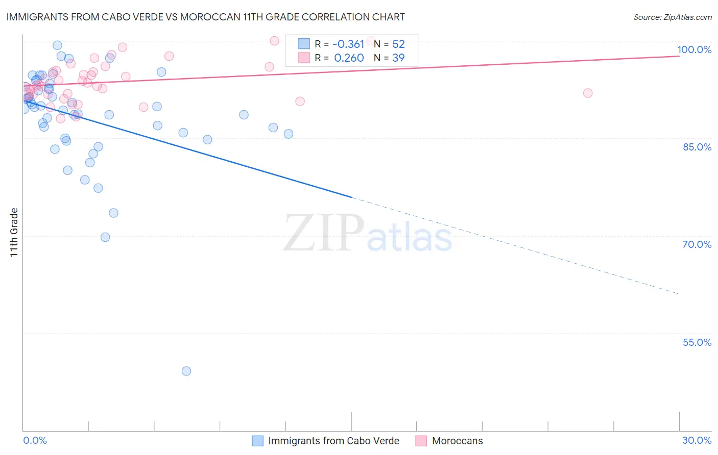 Immigrants from Cabo Verde vs Moroccan 11th Grade Correlation Chart
