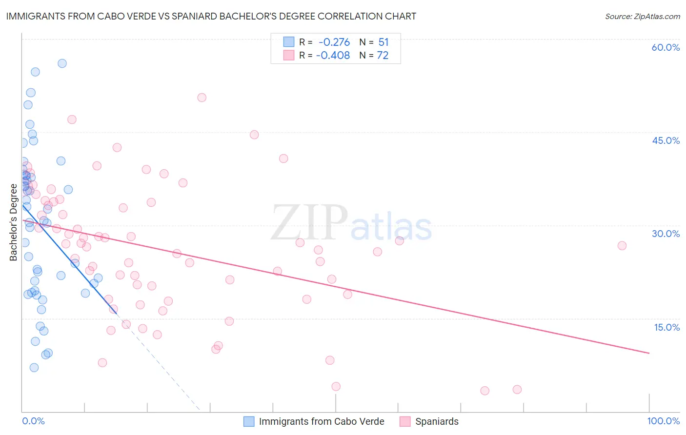 Immigrants from Cabo Verde vs Spaniard Bachelor's Degree Correlation Chart