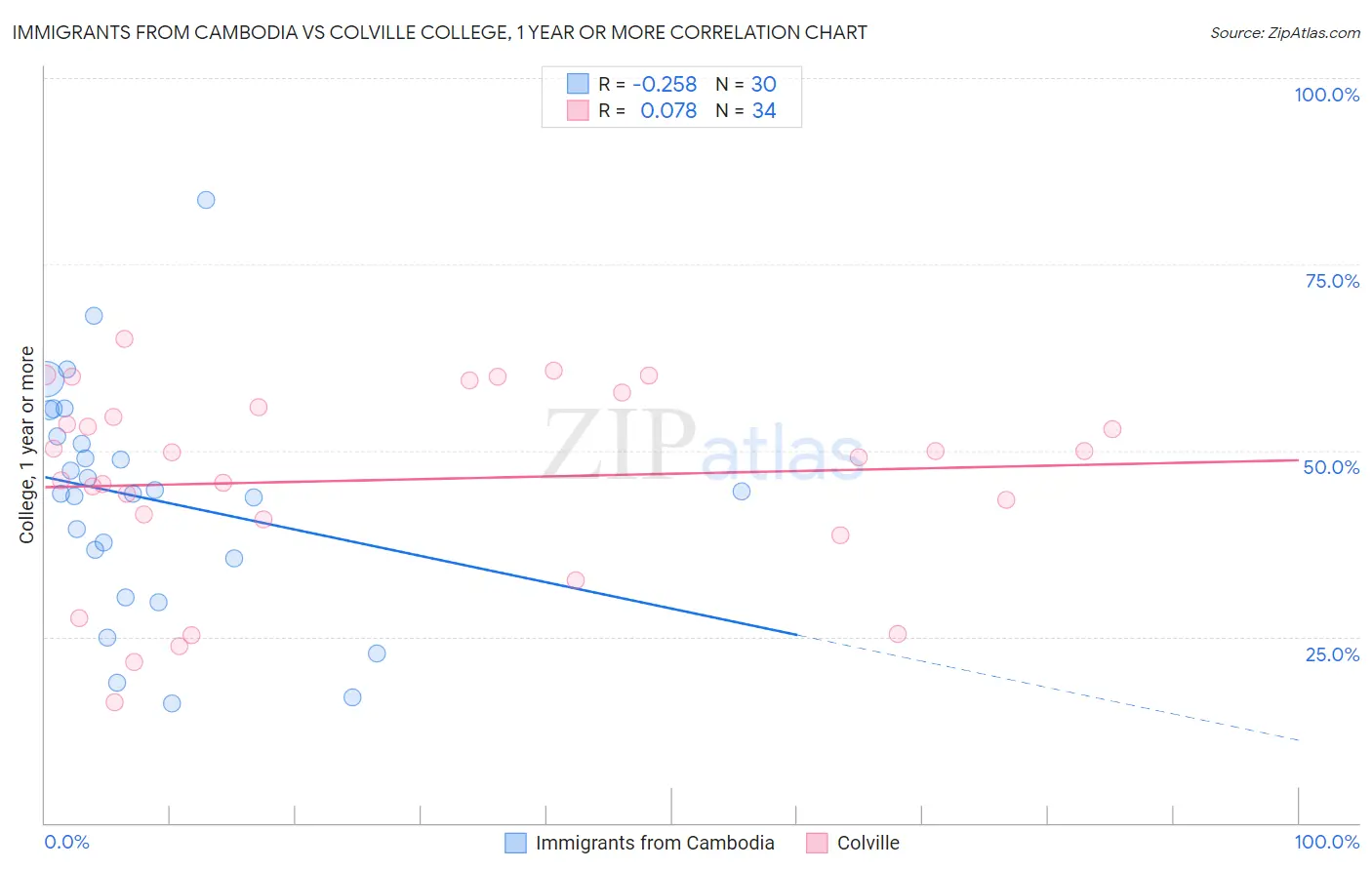 Immigrants from Cambodia vs Colville College, 1 year or more Correlation Chart