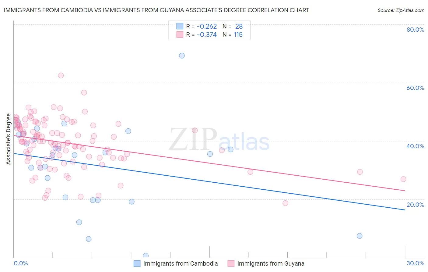 Immigrants from Cambodia vs Immigrants from Guyana Associate's Degree Correlation Chart