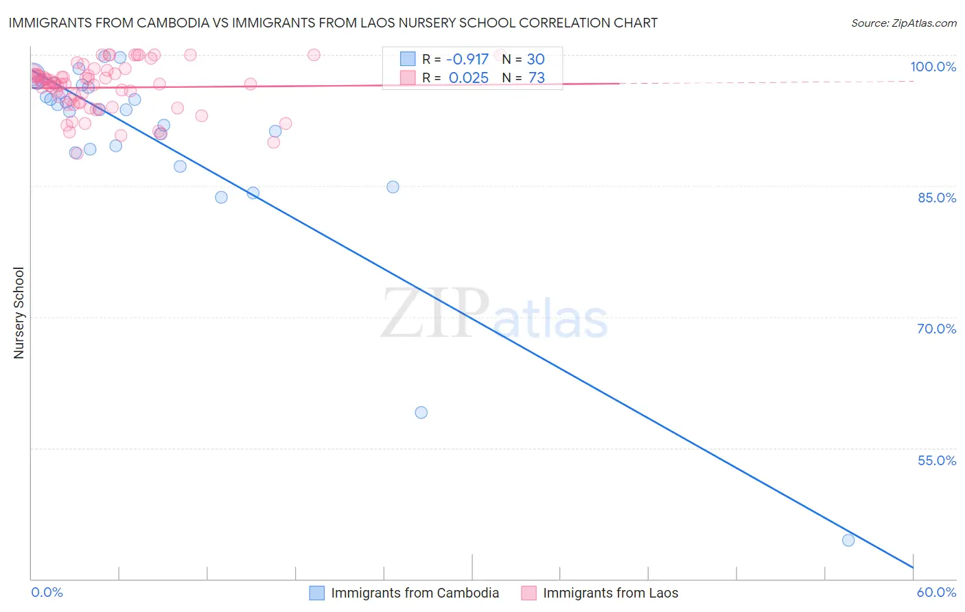 Immigrants from Cambodia vs Immigrants from Laos Nursery School Correlation Chart