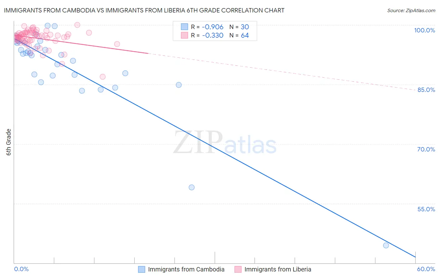 Immigrants from Cambodia vs Immigrants from Liberia 6th Grade Correlation Chart