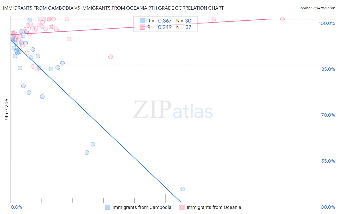 Immigrants from Cambodia vs Immigrants from Oceania 9th Grade Correlation Chart