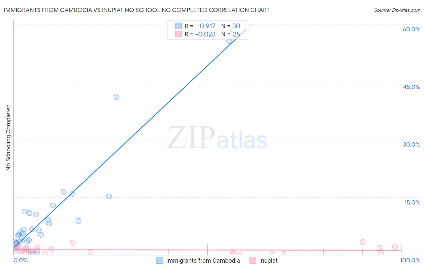 Immigrants from Cambodia vs Inupiat No Schooling Completed Correlation Chart