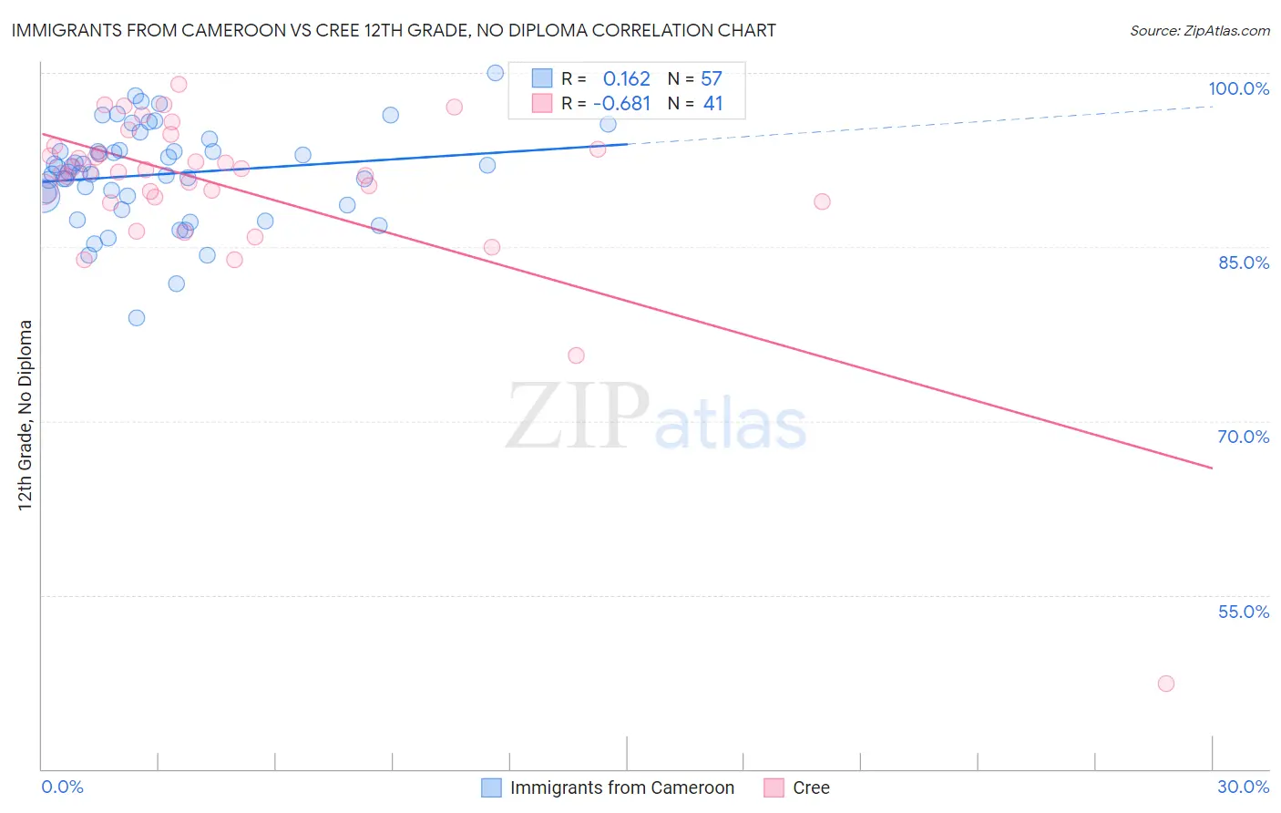Immigrants from Cameroon vs Cree 12th Grade, No Diploma Correlation Chart
