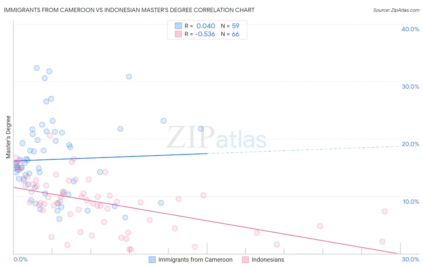 Immigrants from Cameroon vs Indonesian Master's Degree Correlation Chart