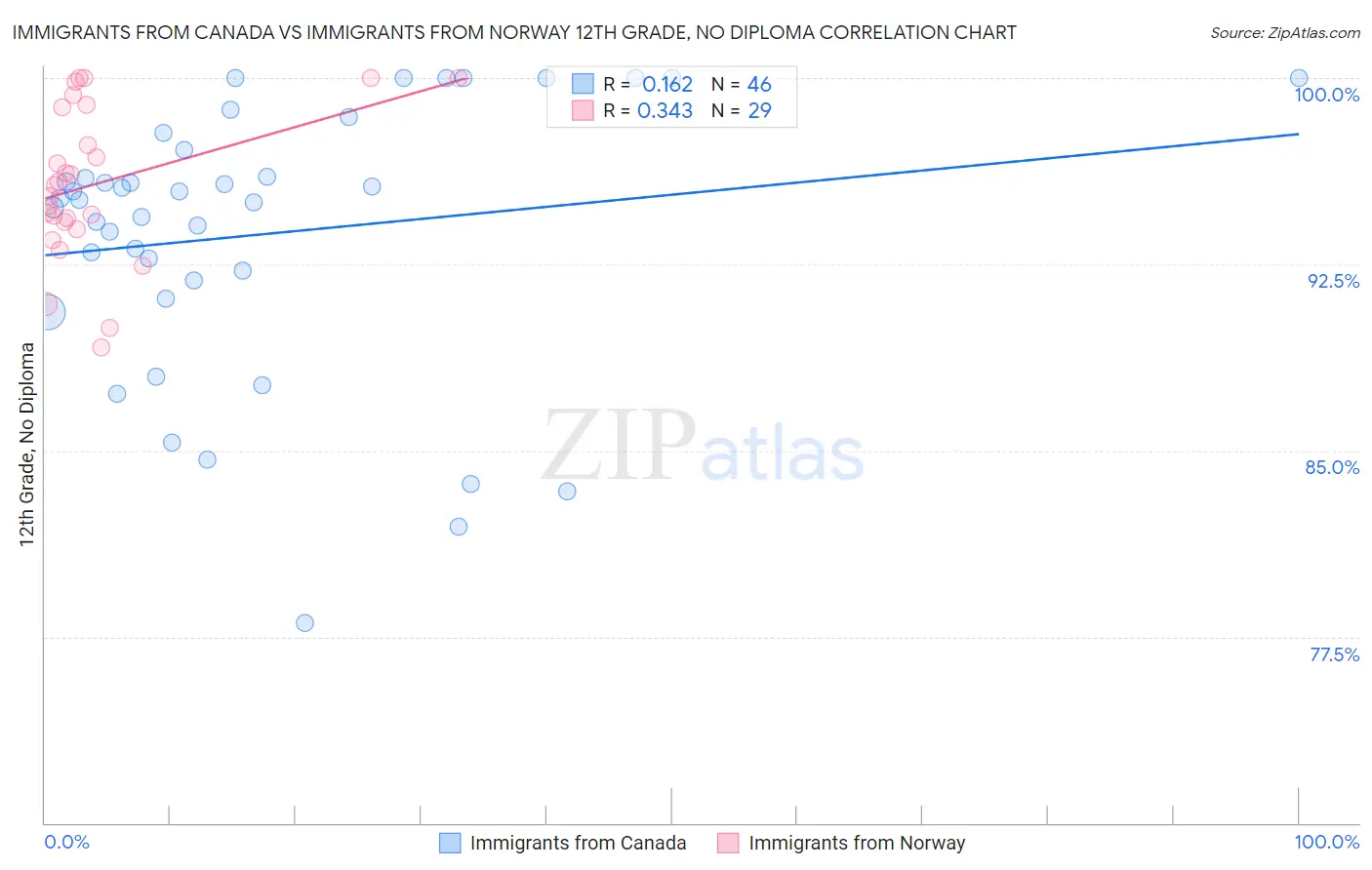 Immigrants from Canada vs Immigrants from Norway 12th Grade, No Diploma Correlation Chart