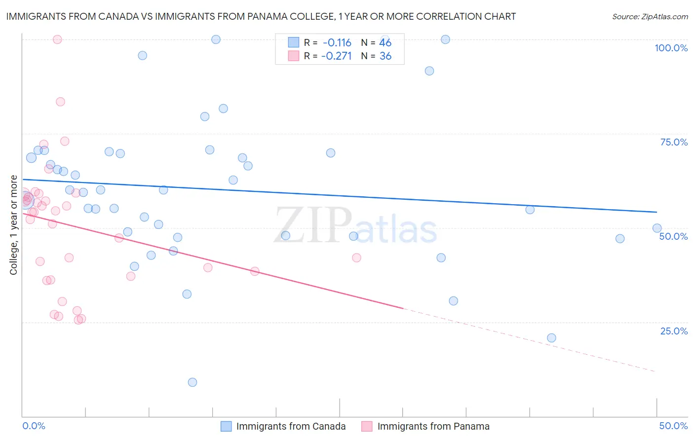 Immigrants from Canada vs Immigrants from Panama College, 1 year or more Correlation Chart