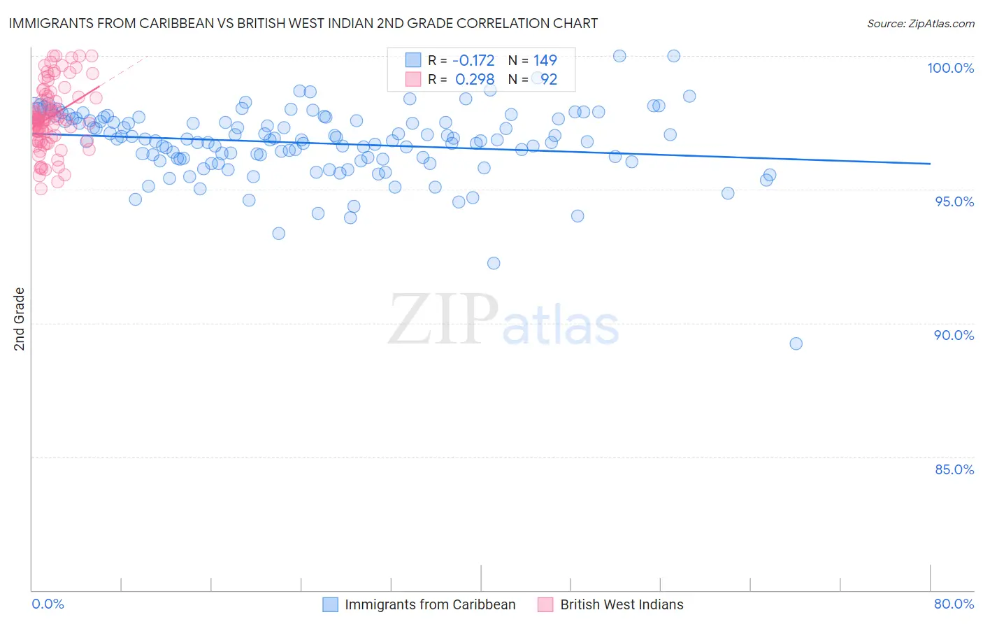 In terms of 2nd grade, the demographic groups most similar to Immigrants from Caribbean are Ecuadorian (96.9%, a difference of 0.0%), Nicaraguan (96.9%, a difference of 0.020%), Immigrants from Somalia (96.9%, a difference of 0.040%), Somali (97.0%, a difference of 0.050%), and Central American Indian (97.0%, a difference of 0.070%). Similarly, the demographic groups most similar to British West Indians are Immigrants from Eritrea (97.2%, a difference of 0.010%), Malaysian (97.1%, a difference of 0.020%), Houma (97.2%, a difference of 0.040%), Immigrants from St. Vincent and the Grenadines (97.2%, a difference of 0.040%), and Immigrants from Afghanistan (97.2%, a difference of 0.040%).