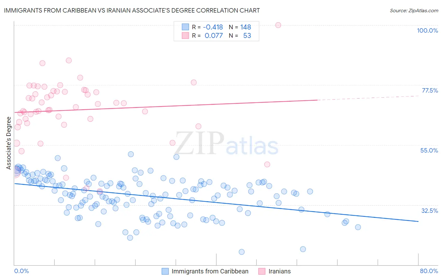 Immigrants from Caribbean vs Iranian Associate's Degree Correlation Chart