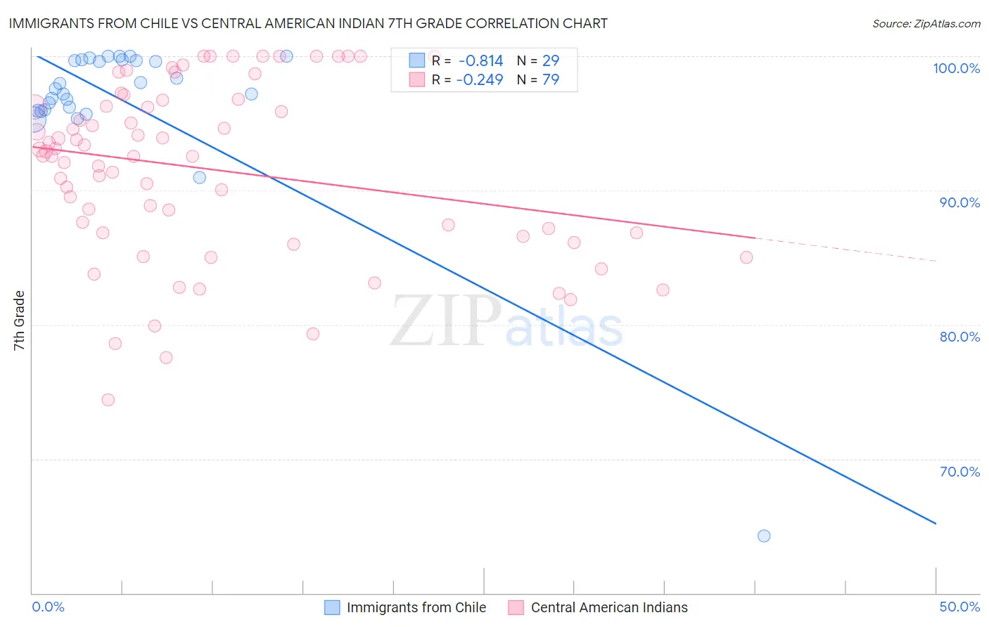 Immigrants from Chile vs Central American Indian 7th Grade Correlation Chart