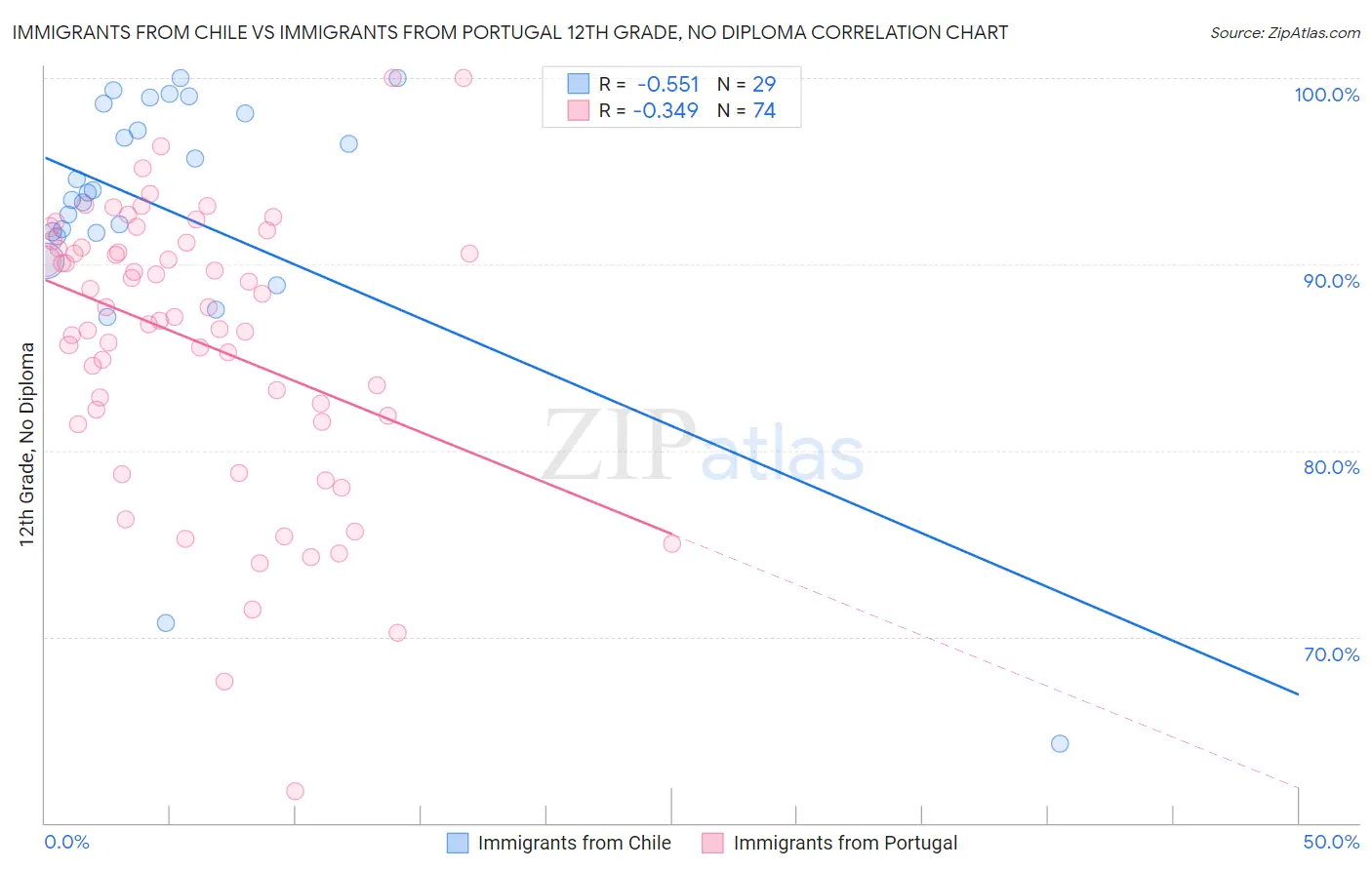 Immigrants from Chile vs Immigrants from Portugal 12th Grade, No Diploma Correlation Chart
