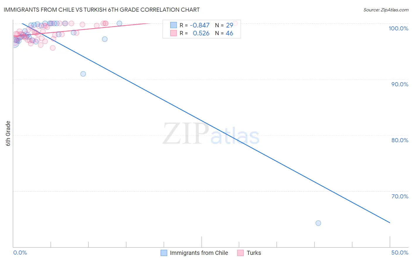 Immigrants from Chile vs Turkish 6th Grade Correlation Chart