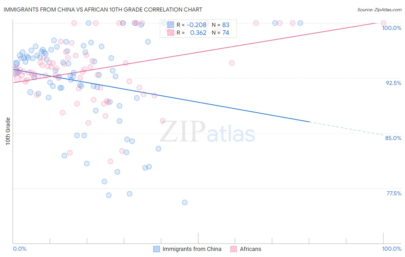 In terms of 10th grade, the demographic groups most similar to Immigrants from China are Somali (93.2%, a difference of 0.010%), Korean (93.2%, a difference of 0.010%), Black/African American (93.2%, a difference of 0.010%), Bolivian (93.2%, a difference of 0.030%), and Immigrants from Ethiopia (93.1%, a difference of 0.030%). Similarly, the demographic groups most similar to Africans are Afghan (93.1%, a difference of 0.0%), South American Indian (93.1%, a difference of 0.010%), Bahamian (93.1%, a difference of 0.010%), Comanche (93.1%, a difference of 0.010%), and Subsaharan African (93.1%, a difference of 0.010%).