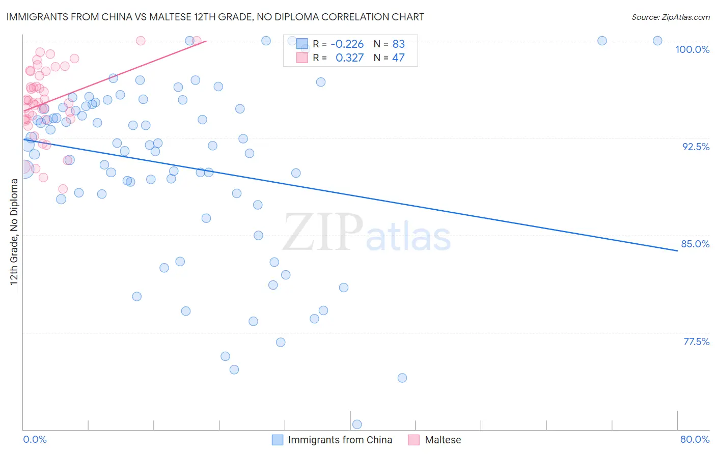 Immigrants from China vs Maltese 12th Grade, No Diploma Correlation Chart