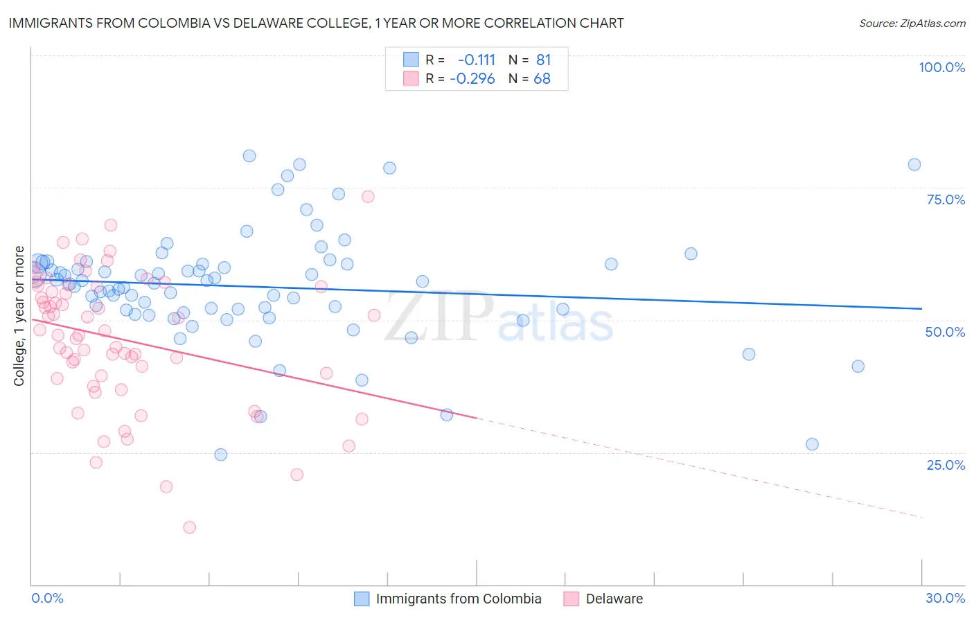 Immigrants from Colombia vs Delaware College, 1 year or more Correlation Chart