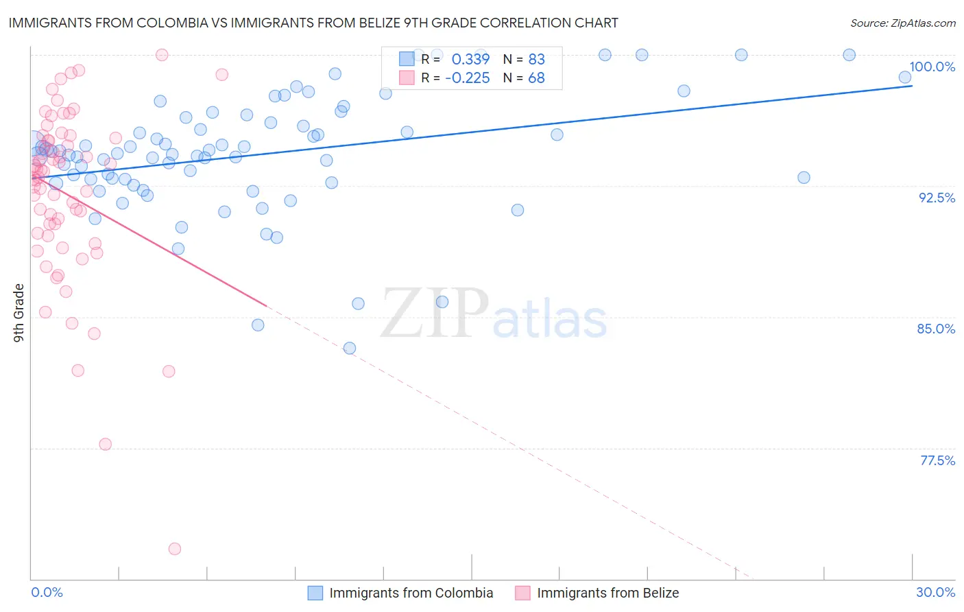 Immigrants from Colombia vs Immigrants from Belize 9th Grade Correlation Chart